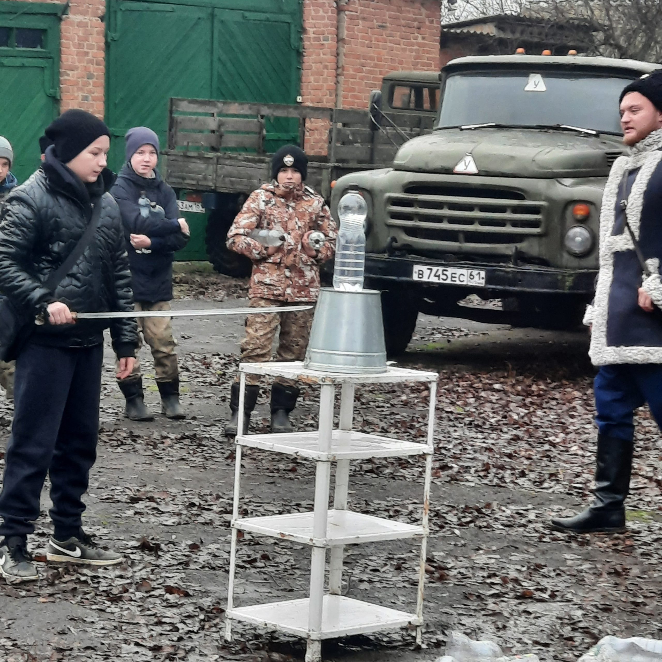 Затем юные казачата, под руководством И.И Губарева, попробовали рубить шашкой наполненные водой пластмассовые бутылки.
