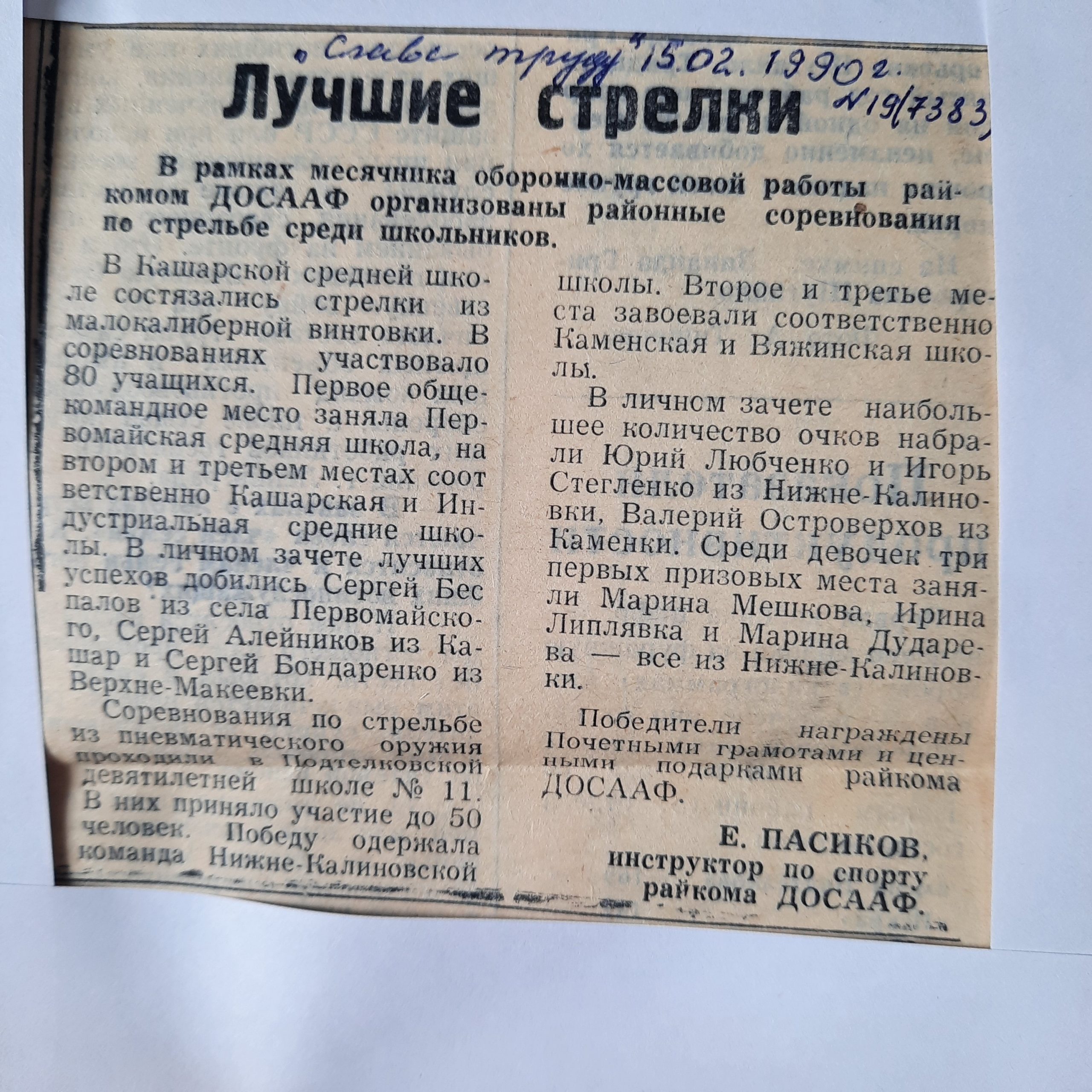 Это вид спорта дошел и до нашего времени таким же популярным среди подростков. Только база совсем не та, что была до 90-х годов. До 1995г во всех школах района было малокалиберное оружие и шесть 25- метровых тиров. В каждой школе, имеющей оружие, были оборудованы комнаты для хранения оружия. Оружие школ, не имеющих таких комнат, хранилось в оружейной комнате РК ДОСААФ, который для спортивных целей имел 8 стволов малокалиберного оружия. Работали повсеместно кружки по стрельбе из малокалиберной винтовки. Кружковцы принимали участие в областных соревнованиях ( газета «Слава труду» от 13.05.1989г.)Проводились районные соревнования (газета «Слава труду» от 21.02.1989г, газета «Слава труду» от 15.02.1990г, газета «Слава труду» от 06.02.1990 г).