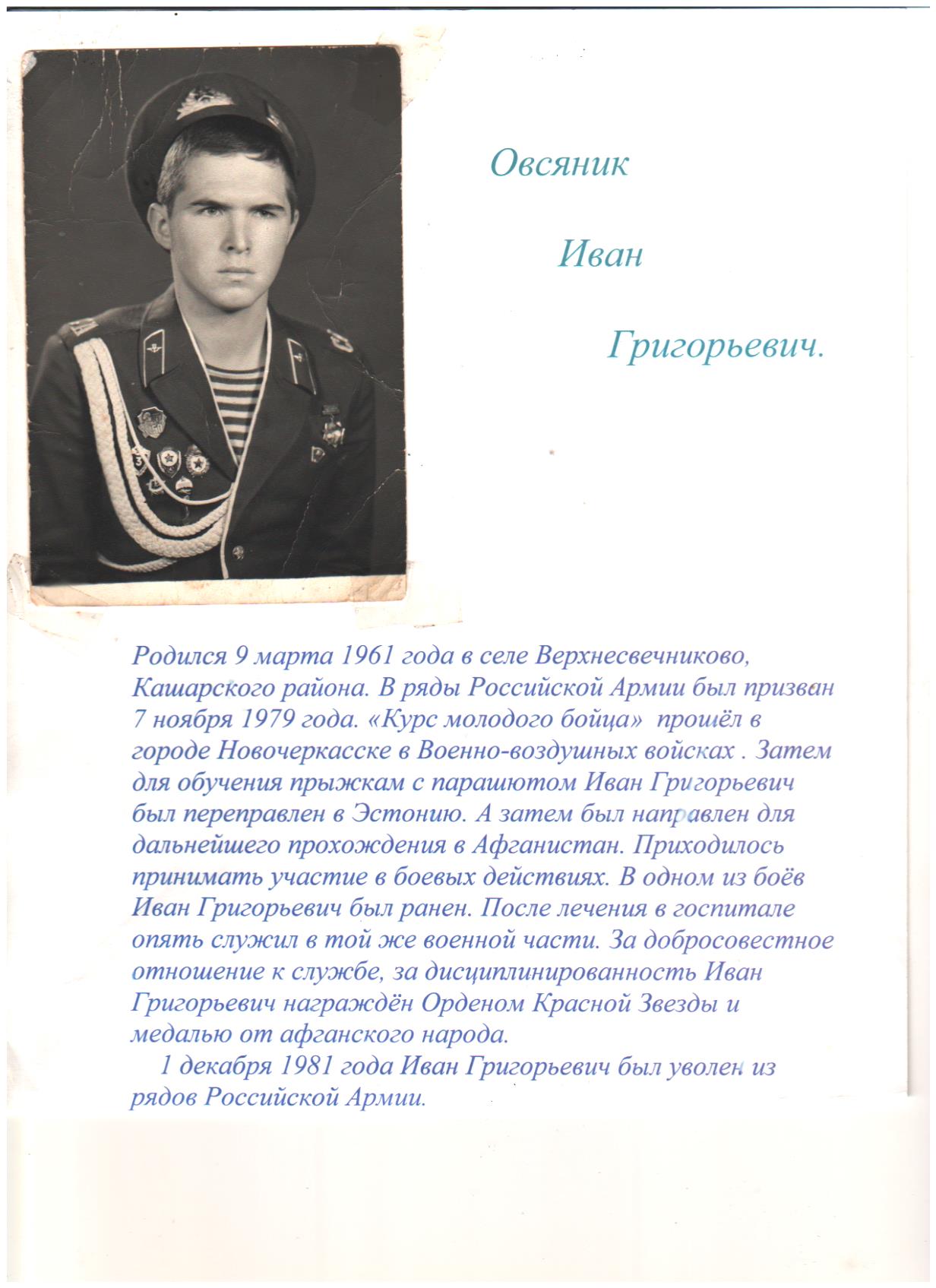 Из уст учителей школы Опрышко В.В., Демченко Т.И.,Гречкиной В.И. учащиеся многое узнали о 40-й Армии советских войск. Работники местного ДК Зимовнова И.В., Богдан В.В. для участников мероприятия исполнили песни 80-х годов военно-патриотической направленности. На это торжественное мероприятия приглашены почетные гости Овсянник И.Г., житель села Верхнесвечниково, проходивший службу в Афганистане, участвовавший в боевых действиях, раненный в одном из боев. После лечения в госпитале продолжил службу в той-же воинской части. За добросовестную службу Иван Григорьевич награжден Орденом Красной Звезды и медалью от афганского народа.(фото декабрь 1981г)