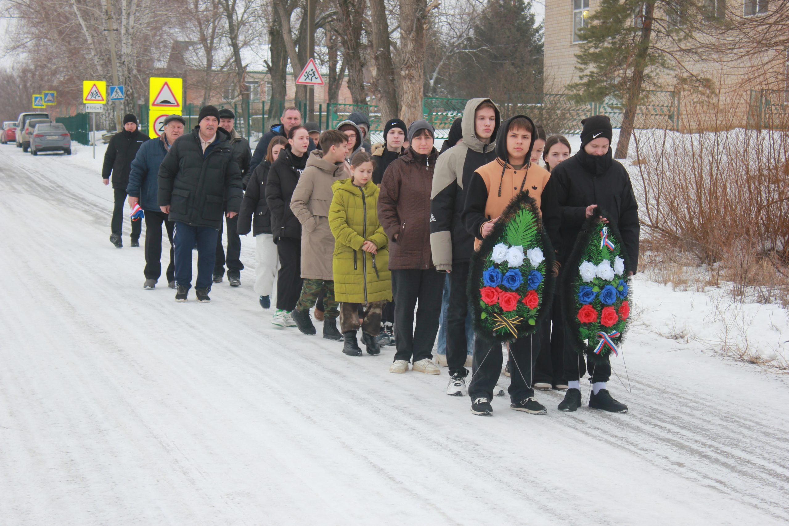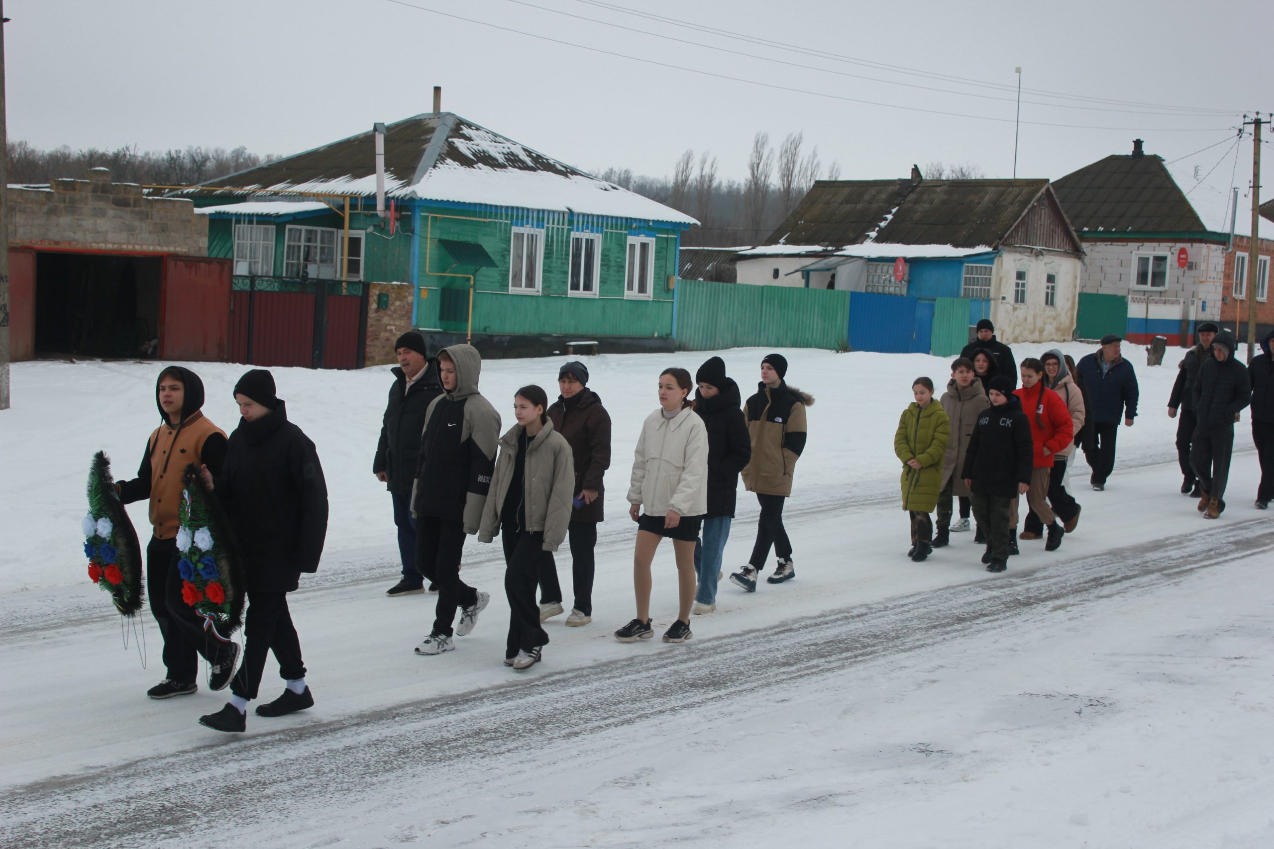 9:00 по Московскому времени возле Ново-Павловской ООШ построение под командованием Огиенко В.П.-начальника объединения преподавателей ОБЗР. Далее организованной колонной направились к памятнику погибших воинов в годы ВОВ для возложения венков.